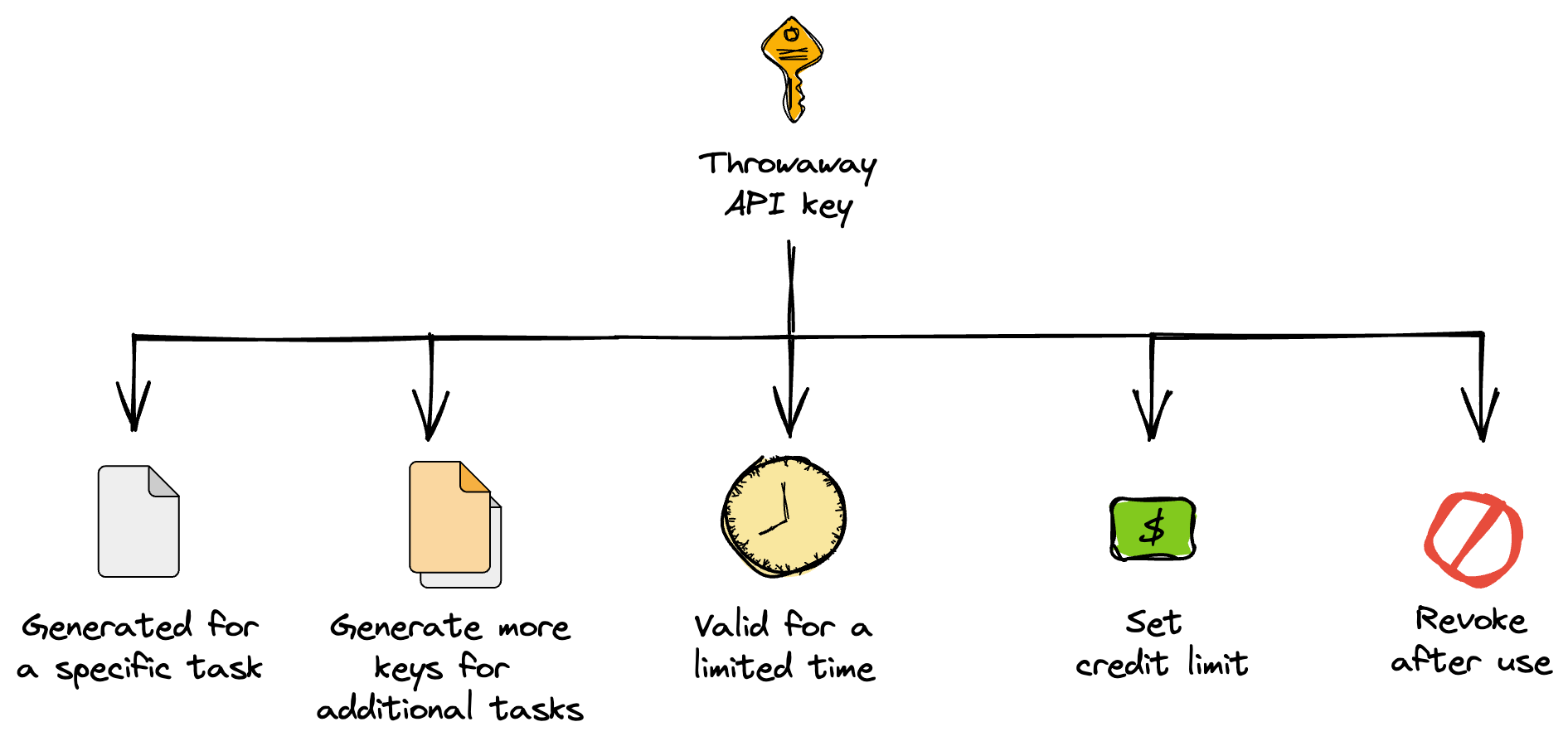 Throwaway API keys are temporary and short-lived ones that are used briefly and then discarded (or expired).