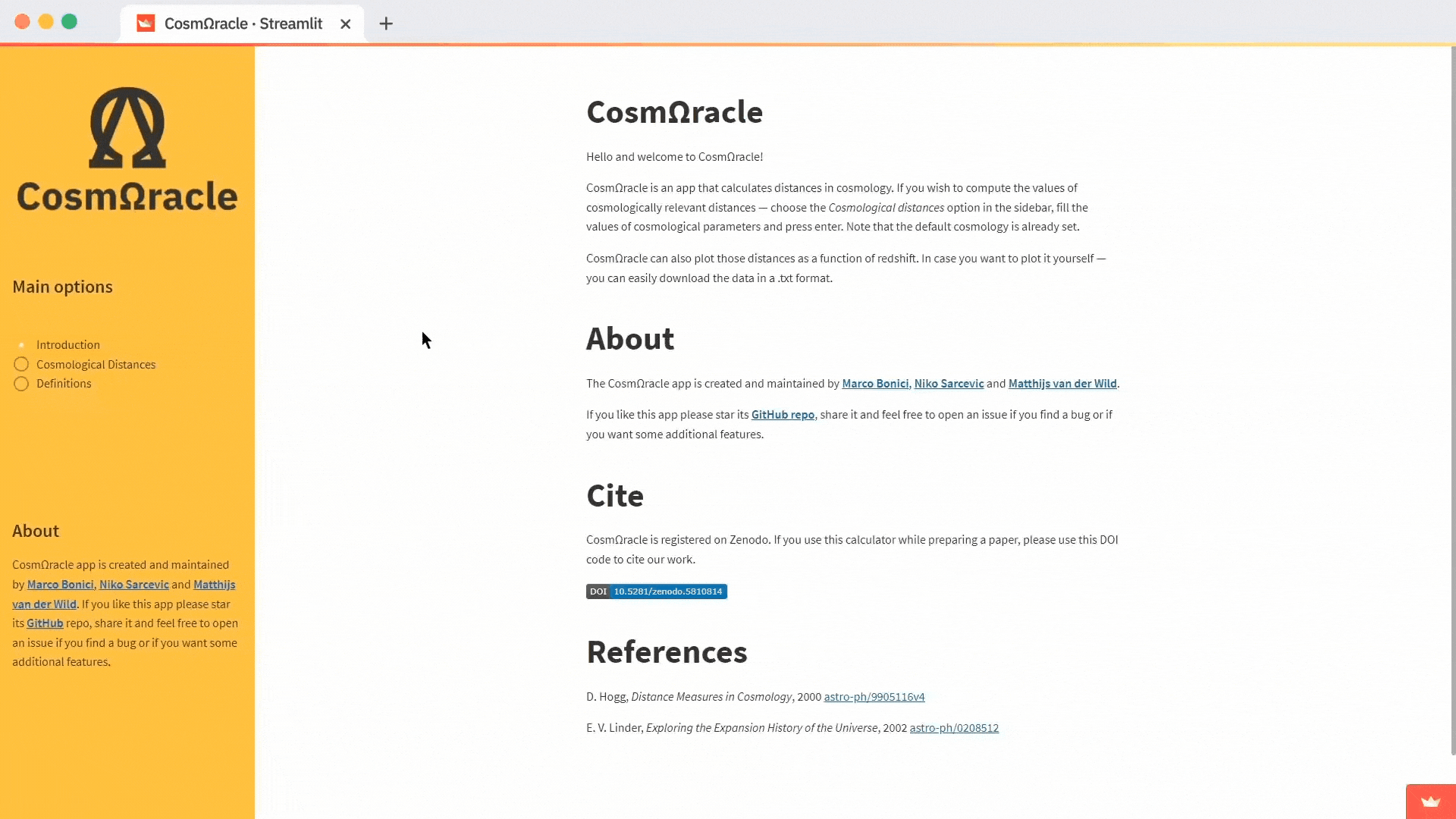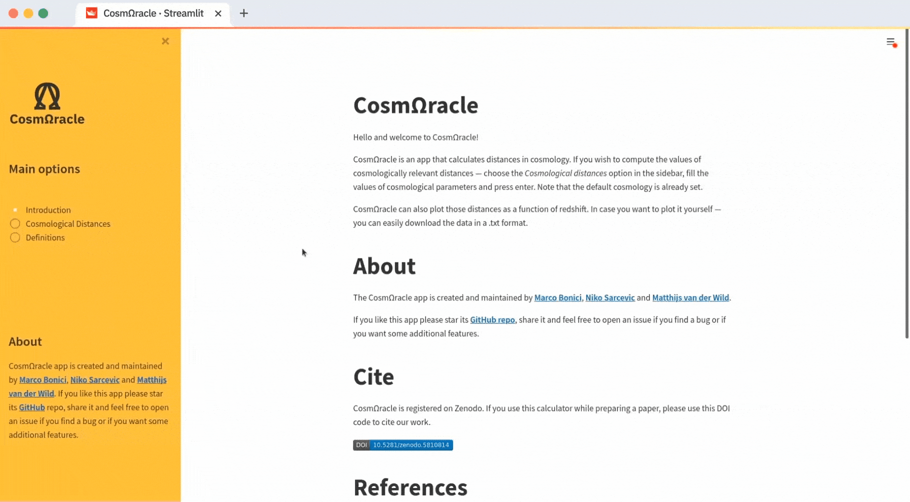 Until recently, we calculated these distances with the first online version of the famous Ned Wright’s Cosmo Calculator from 1999 or with the astropy cosmology package. Although these are great tools, we felt that there was a need for an improved and modern version.