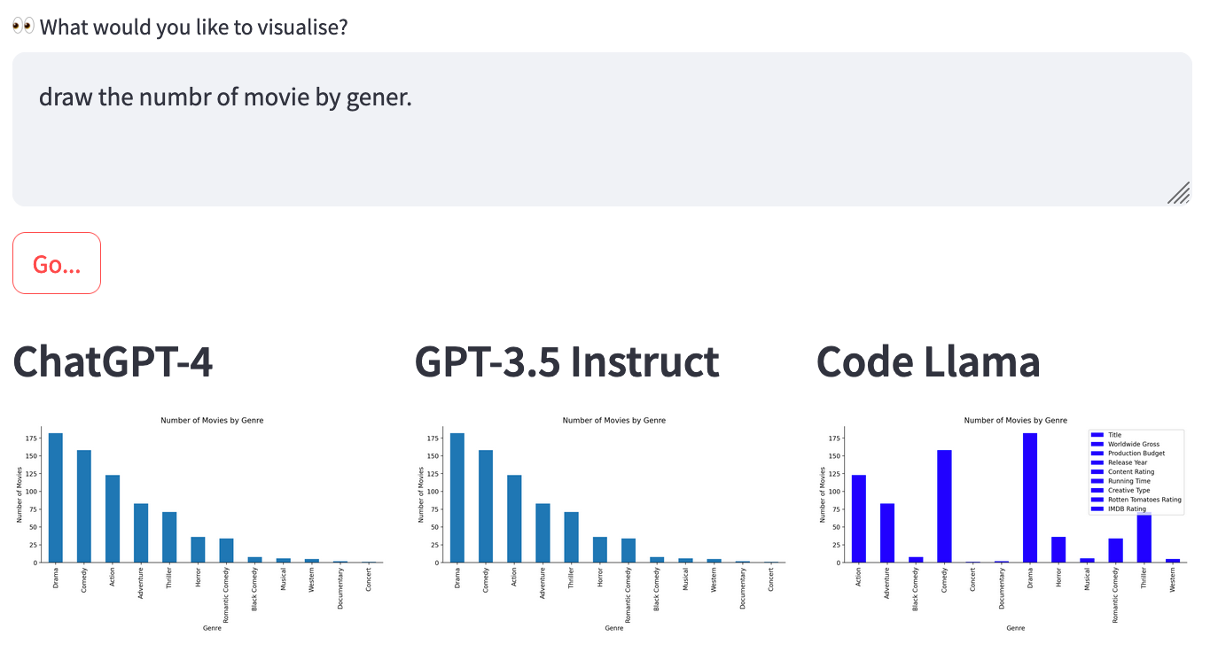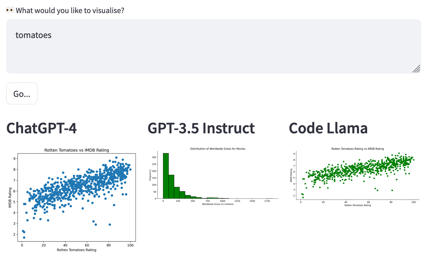- GPT-3.5 Instruct ❌ This model did not identify a relevant “tomato” visualisation to the movie data set.