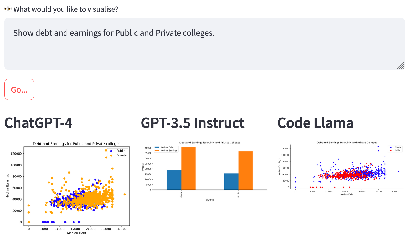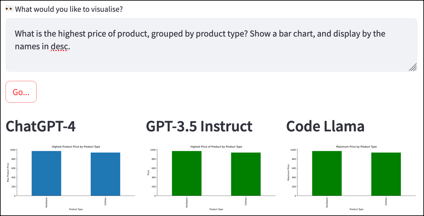Open source models, like Code Llama, are free to use, and easier to fine-tune on your own data. OpenAI models are easy to use “out of the box”, with some now available to fine-tune, but come with a cost. Historically, I’ve faced challenges using open source models, finding they often misunderstood the request or failed completely to generate accurate Python code.