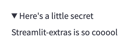 stoggle("Here's a little secret", "Streamlit-extras is so cooool")