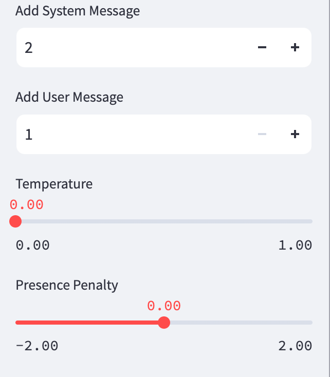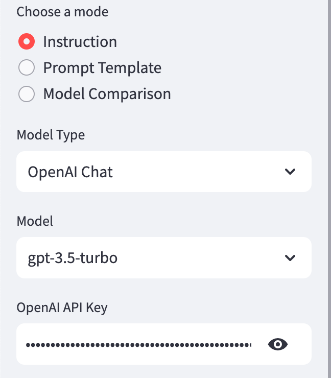 Streamlit has a handy sidebar component where most configuration UI is kept separate from system and user messages. In our case, the inputs displayed on this sidebar are dynamic. When running the app in "Instruction" mode, you'll see something like this: