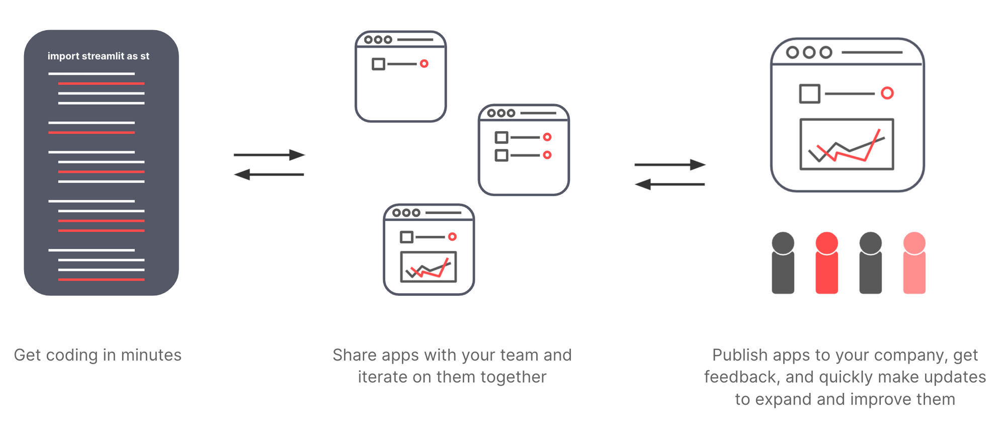 Build your Streamlit apps the way you've always built them! Download the open-source library, use your favorite IDE, and take advantage of Streamlit's run-on-save rapid development flow. Done building? Use Streamlit Cloud to watch your app go live across the company.
