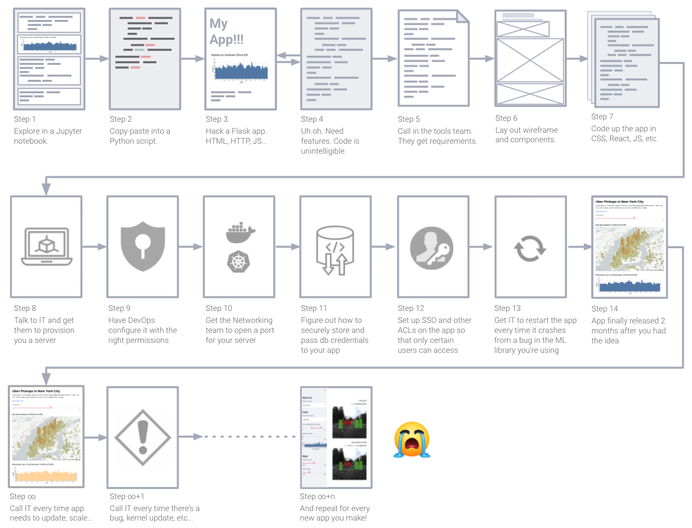 Streamlit Cloud moves you beyond the dashboard and into a new world of bespoke, predictive tooling where your company can run "at the speed of data science." We've watched companies go from having a handful of slow, poorly maintained tools to launching thousands of apps a year. It completely transformed how they work with data.