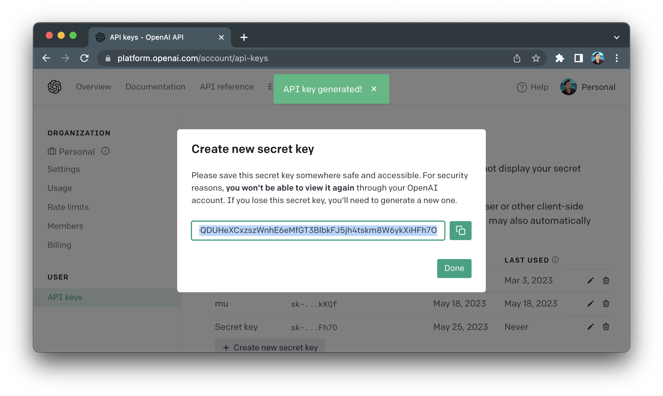Create secret keybutton. - Copy the API key to be used in this tutorial (the key shown below was already revoked):