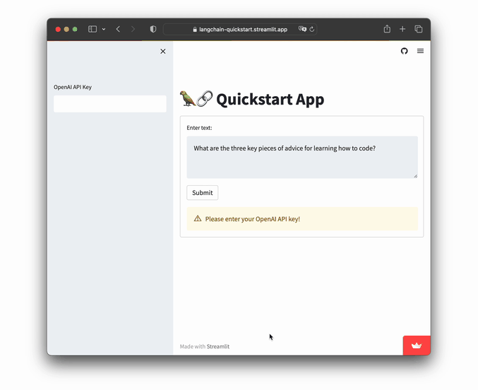 Copy/paste your API key (see how to get it in Step 1 below), then type in "What are the three key pieces of advice for learning how to code?" and click Submit: