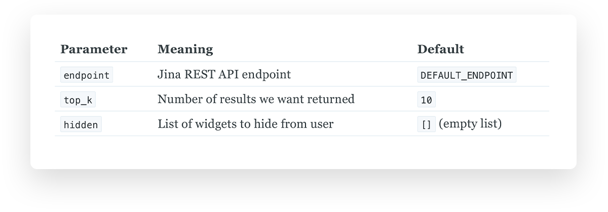 For the Jina Streamlit widgets you can also pass in other parameters to define number of results you want back or if you want to hide certain widgets.